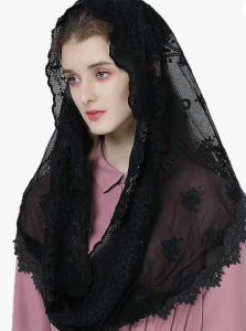 For Hallowmass, I prefer to wear a black mantilla or infinity veil – see below